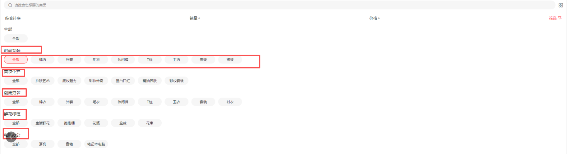 - 二级分类:展示顶级分类+次级分类,支持更细致的商品归类