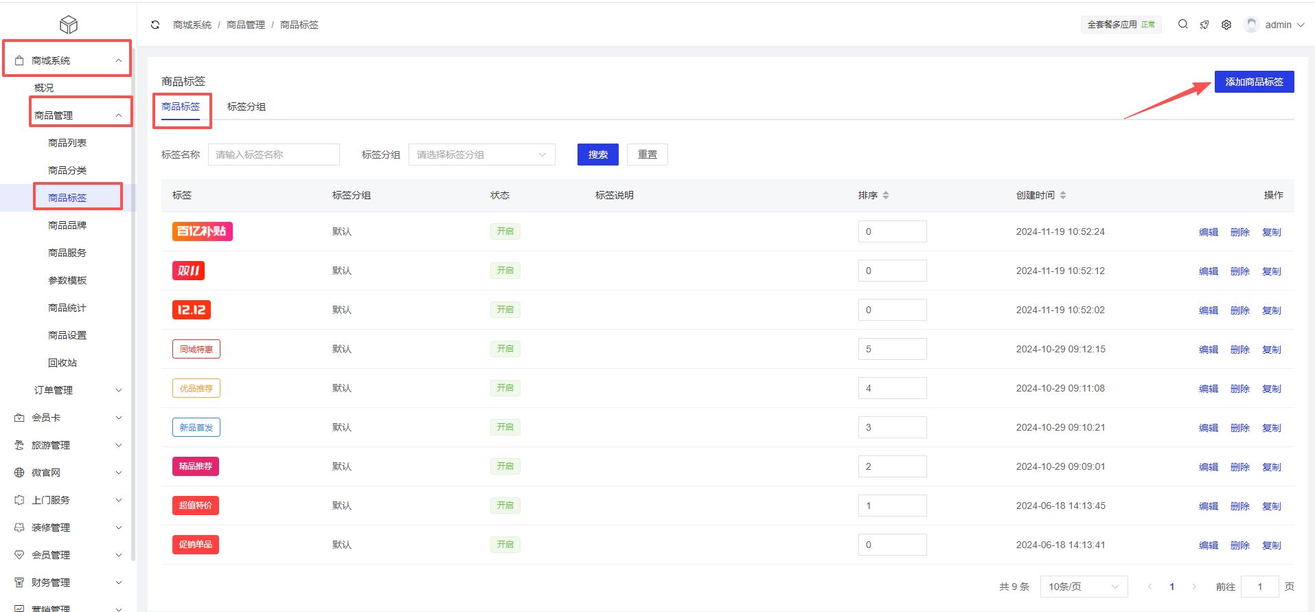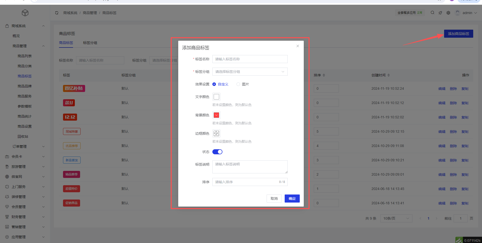 1、添加商品标签:商城系统 >商品管理 >商品标签 >添加商品标签