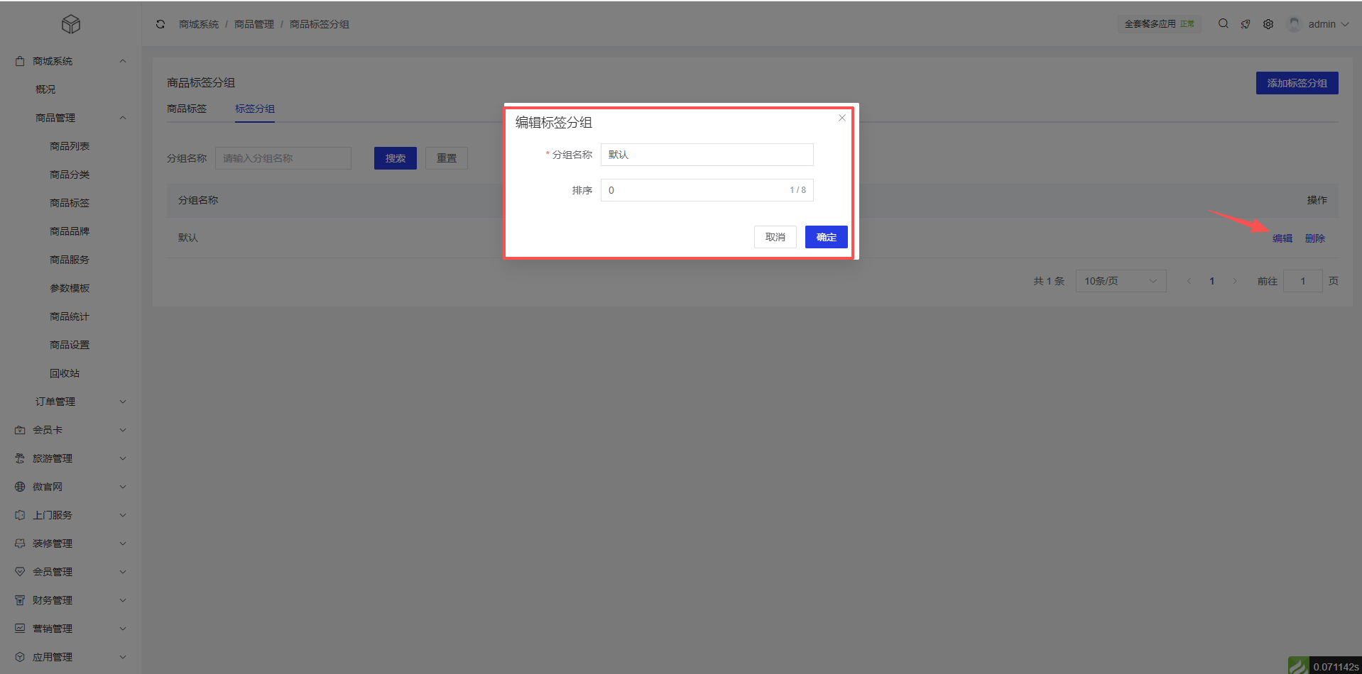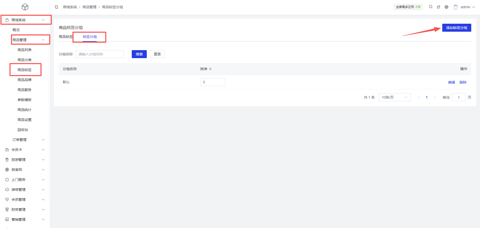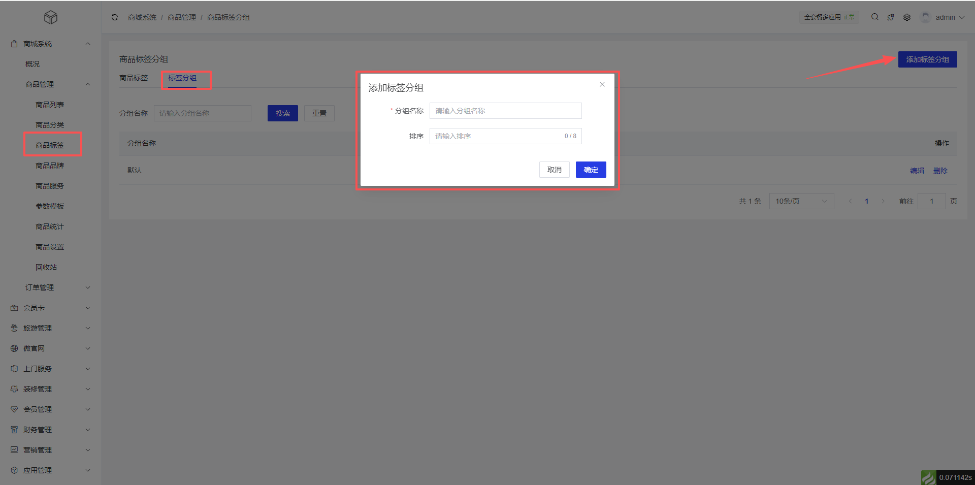 2、标签分组:商城系统 >商品管理 >商品标签 >添加标签分组
