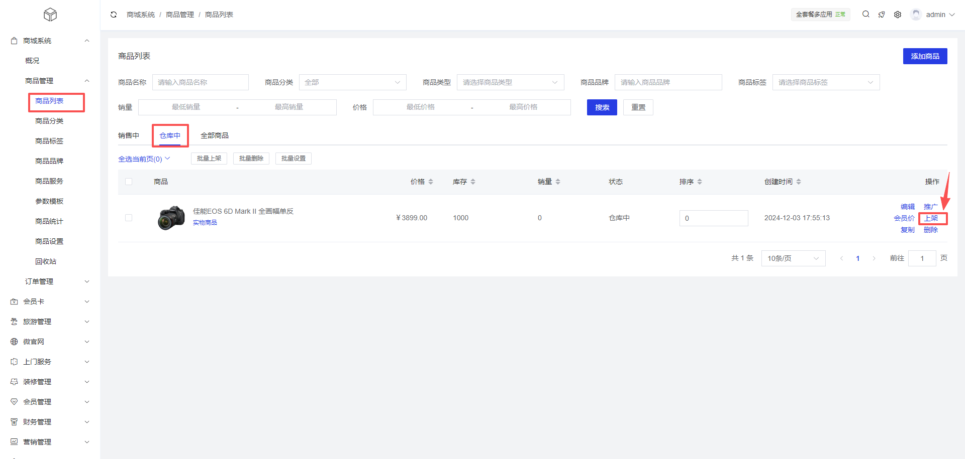 操作步骤: 商城系统 >商品管理 >仓库中> 上架