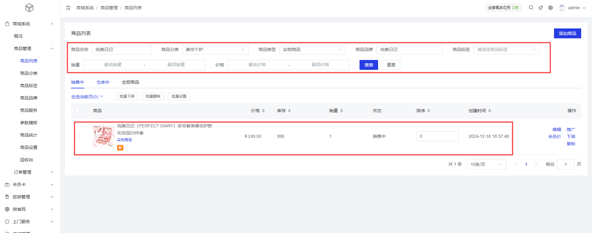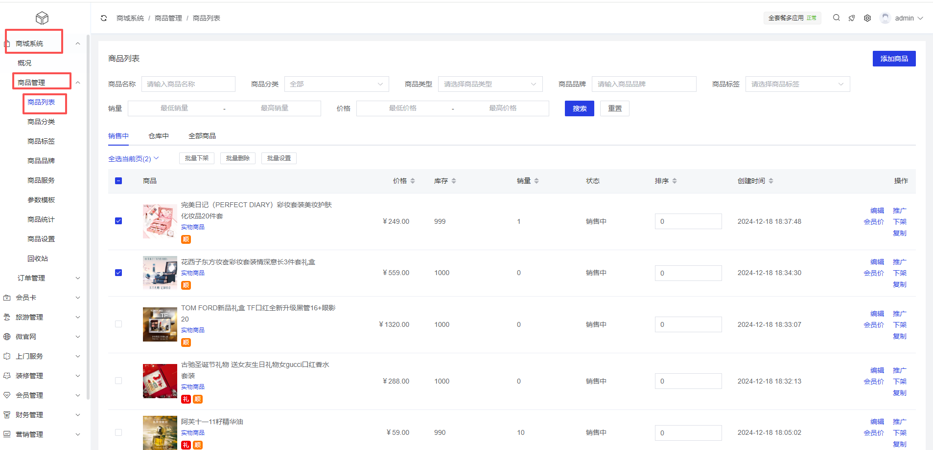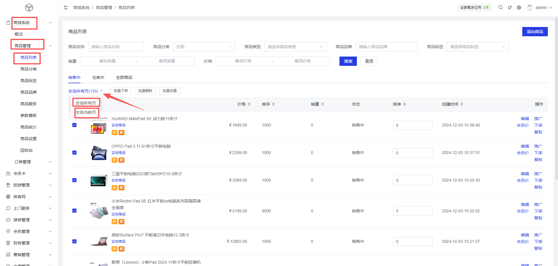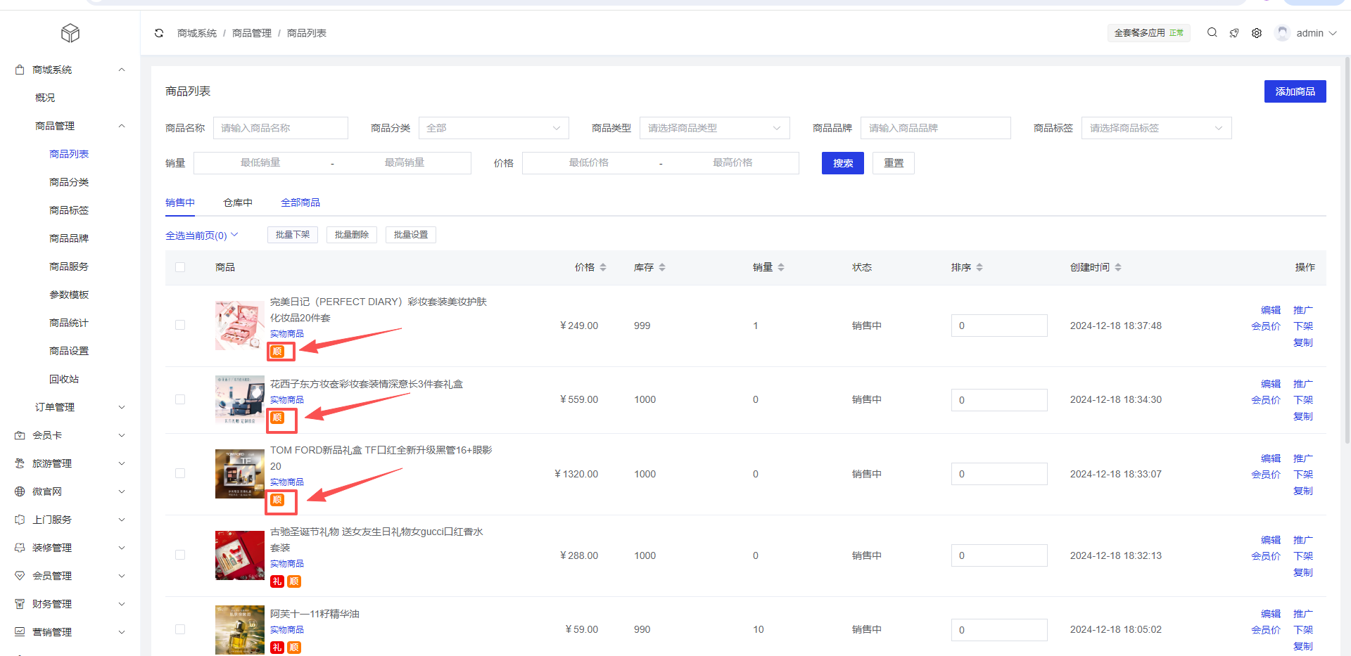 | 商品筛选 | 支持商品名称、分类、类型、品牌、标签等多维度组合筛选 |