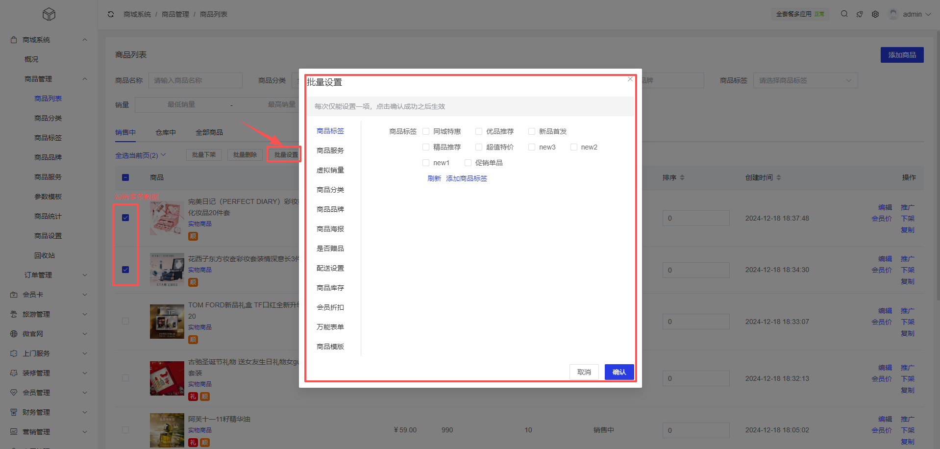 - 进行批量配送设置时,只针对实物商品有效,虚拟商品不支持批量配送设置