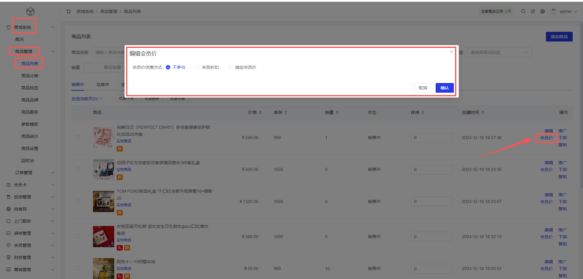 操作步骤: 商城系统 >商品管理 >商品列表 > 会员价