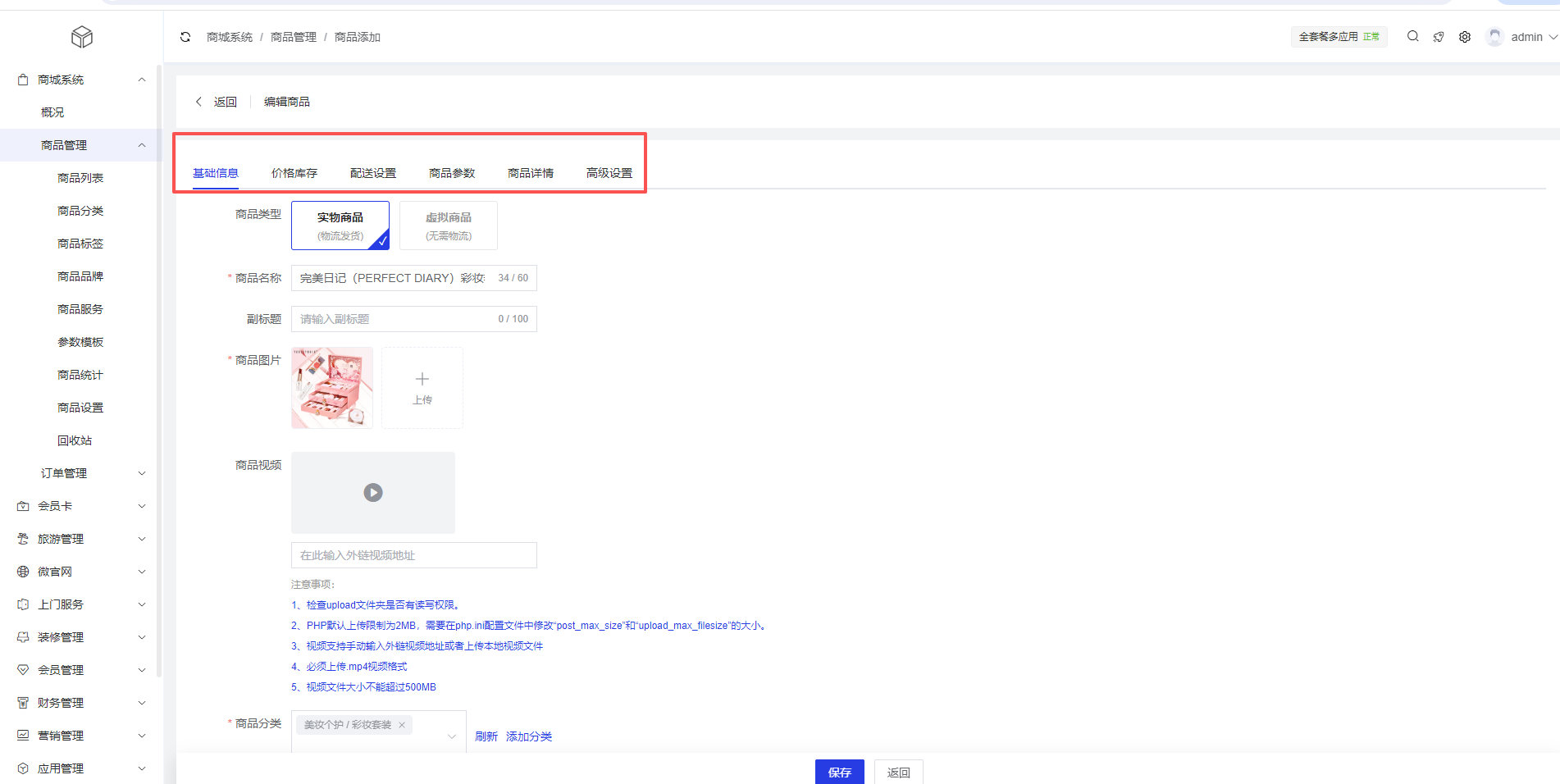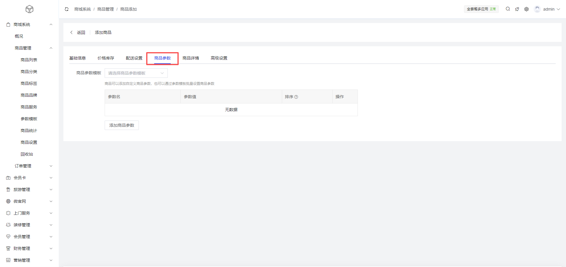 - 参数模板可在商城系统 >商品管理 >参数模板进行设置