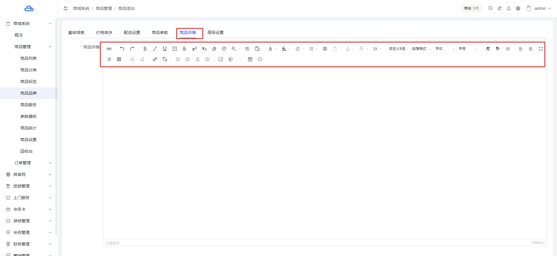 商品详情通过富文本编辑器实现多类型内容展示,支持图文混排和多媒体嵌入,满足多样化排版需求,提升商品转化效果。