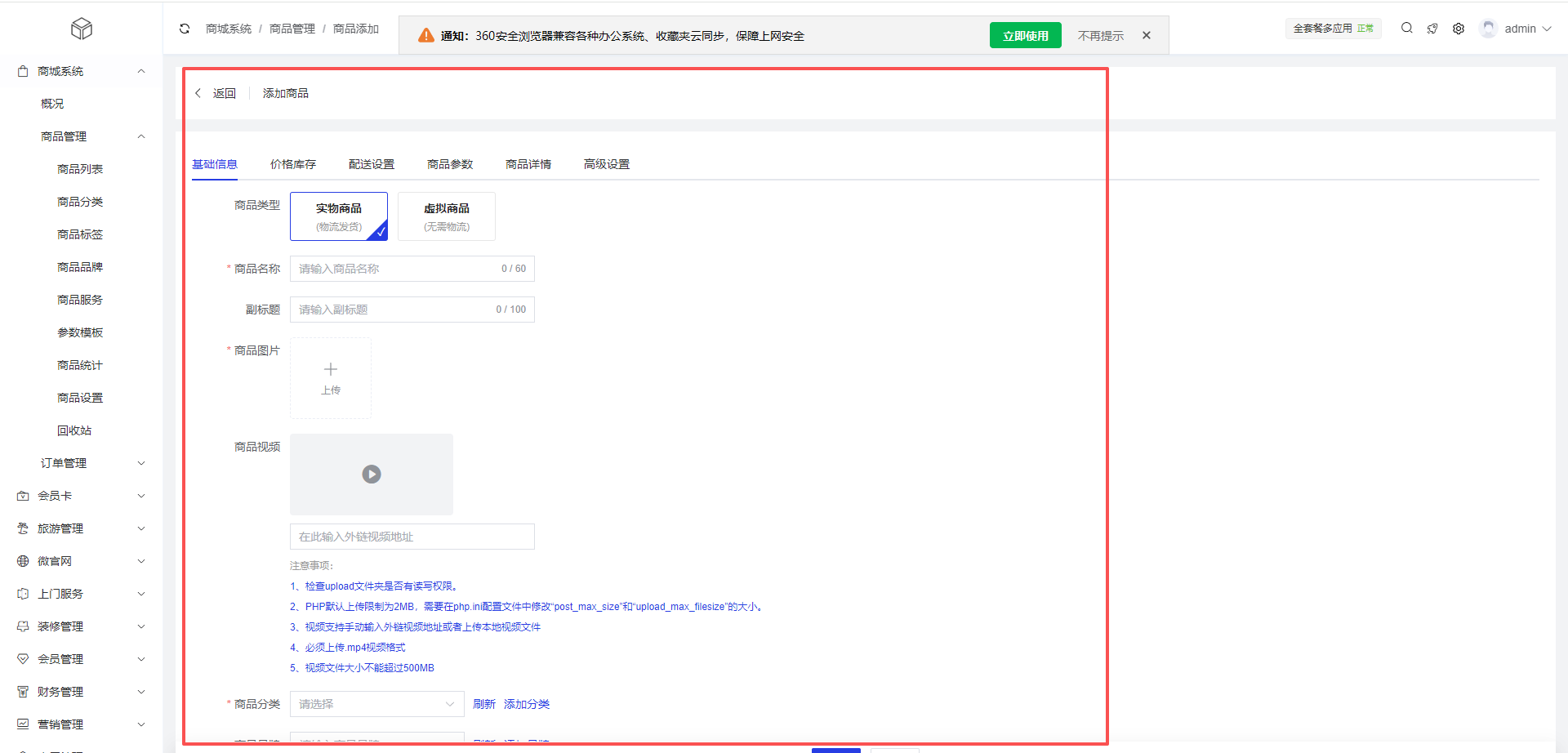 添加商品可分为基础信息、价格库存、配送设置、商品参数、商品详情和高级设置。每个模块对应设置商品不同的信息。以下将按添加流程顺序对各模块功能进行详细说明。"