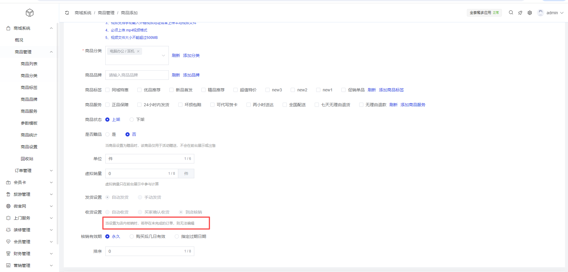 针对虚拟商品:当【收货设置】为到店核销时,若存在未完成的订单,则无法进行编辑【发货设置】、【收货设置】。