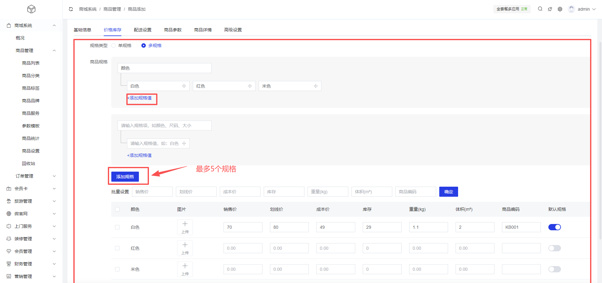 - 单规格/多规格: 必选项,控制商品SKU管理模式。单规格适用于无属性差异商品;多规格支持颜色、尺寸大小等多维度属性组合管理(最多添加5个规格项)
