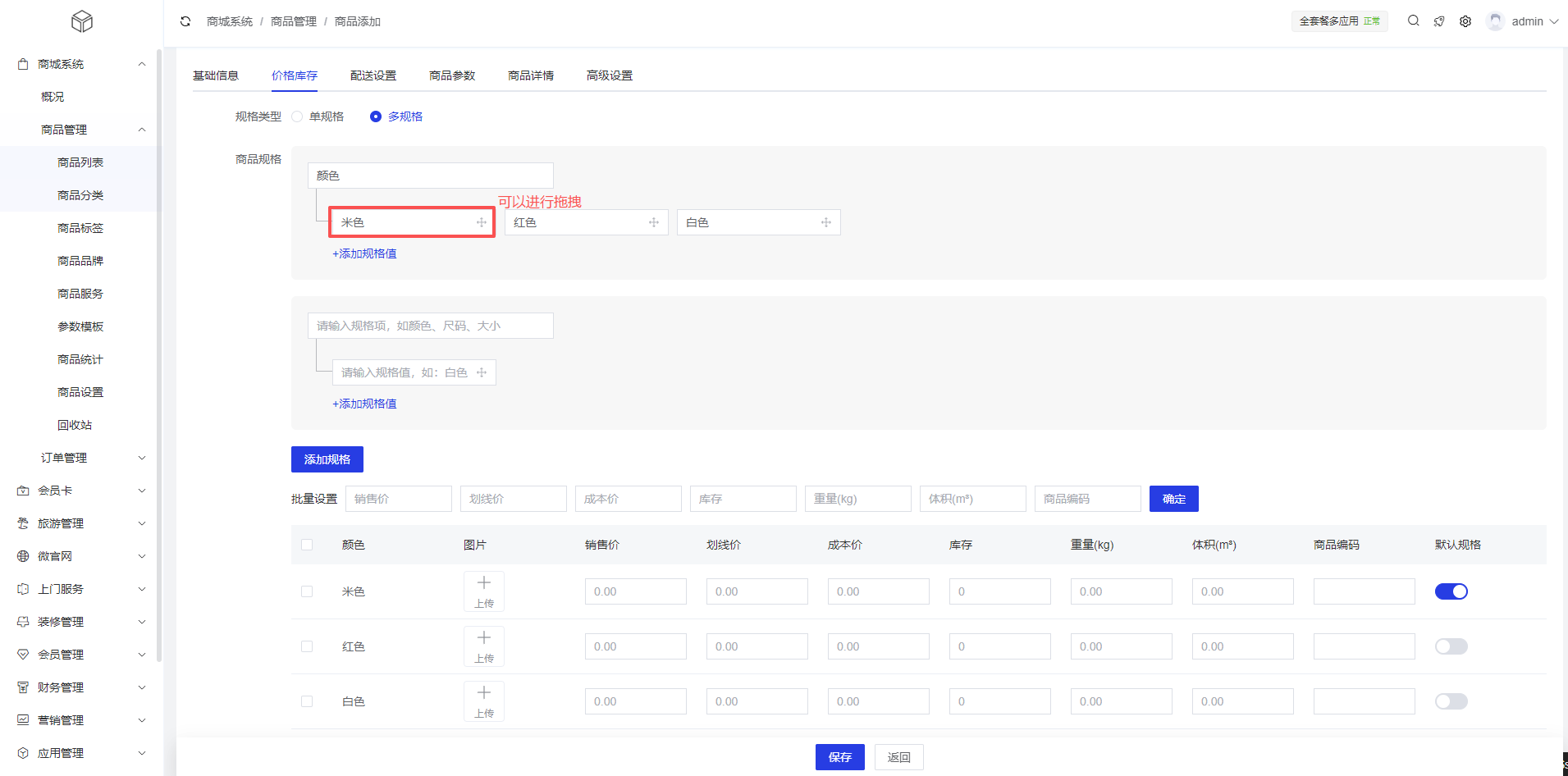 - 体积: 选填项,商品体积(m³),精确到两位小数,用于仓储空间计算