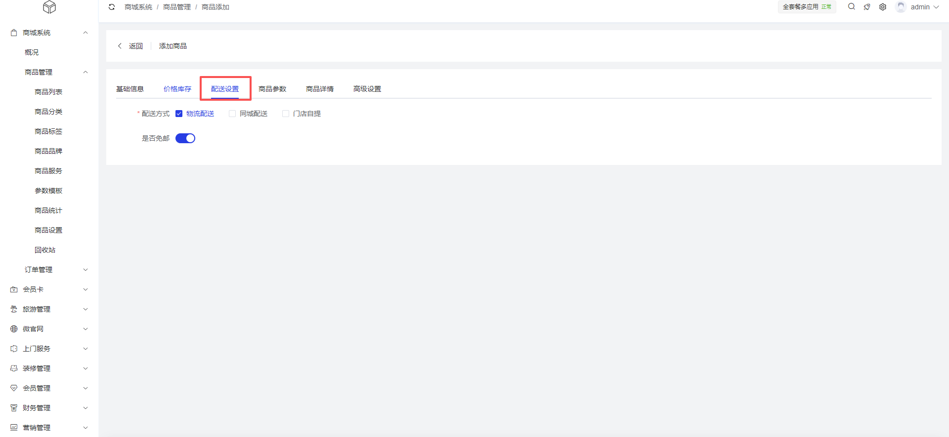 - 配送方式: 必选项,支持多选(物流配送/同城配送/门店自提),控制商品的配送渠道
