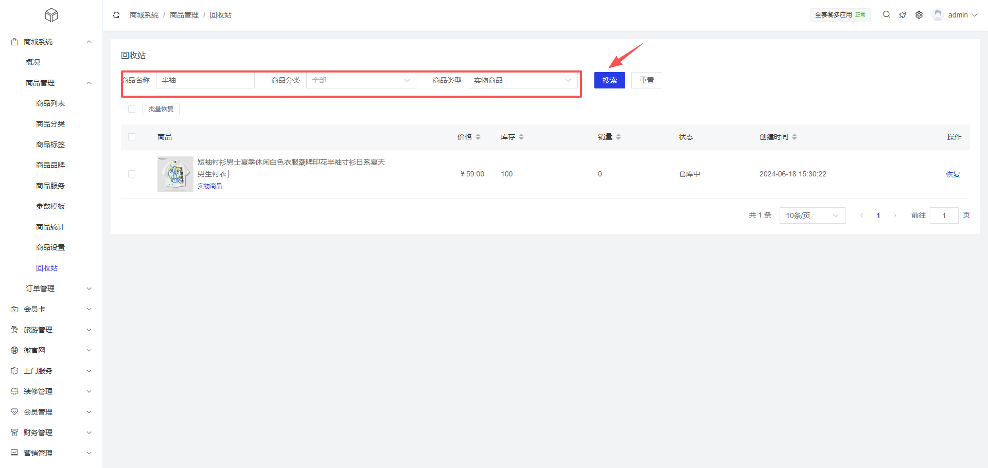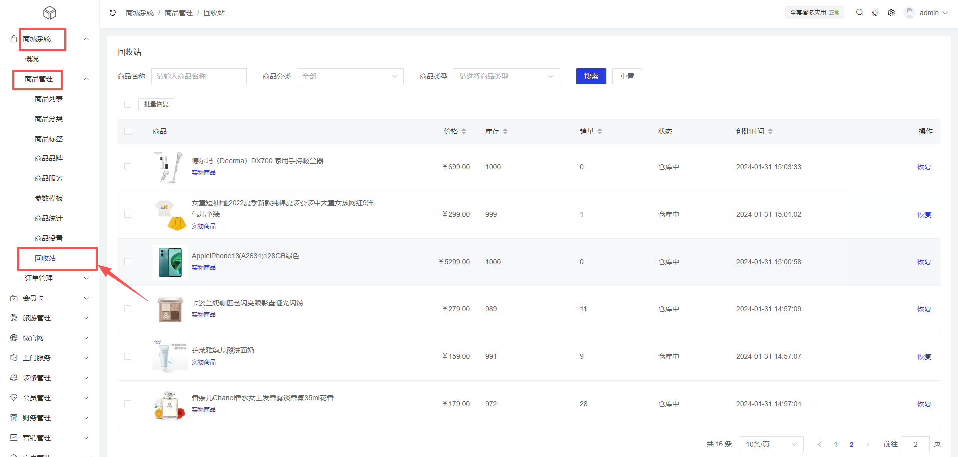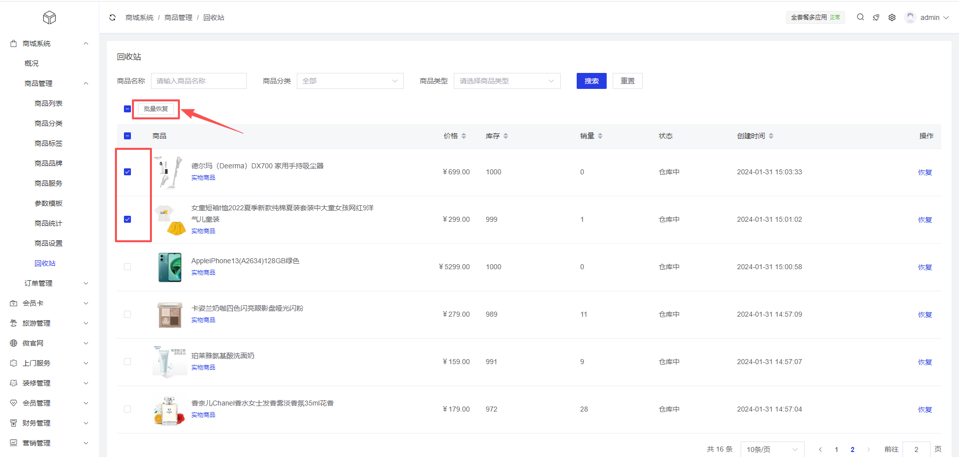 展示所有被删除的商品信息,支持多维度筛选和批量操作