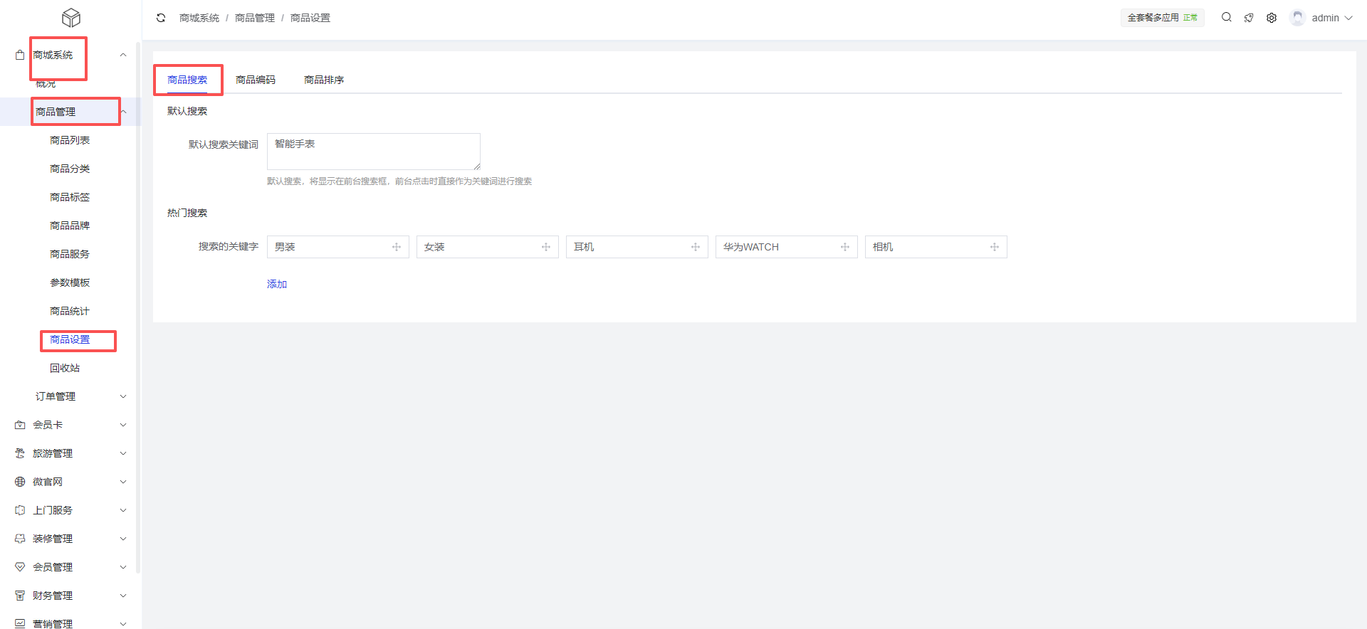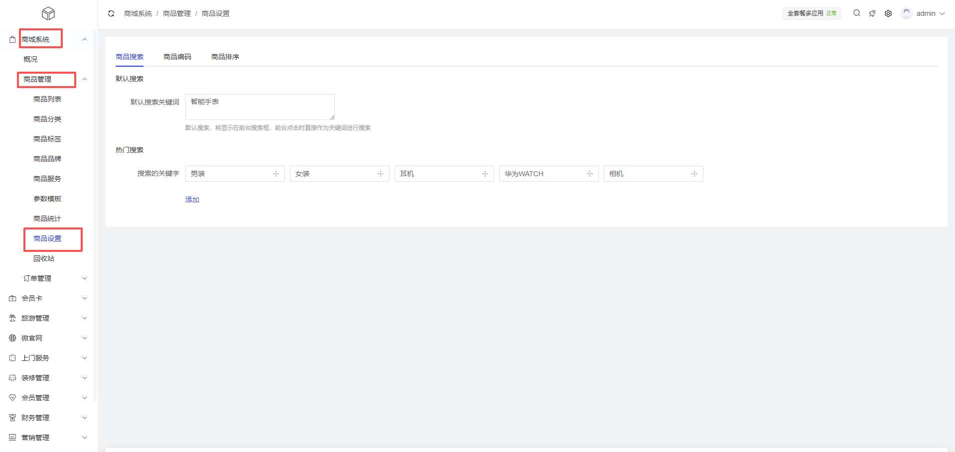 - 设置商品搜索规则,包括默认搜索关键词和热门搜索词