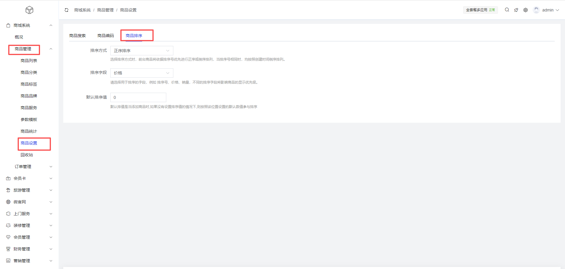 - 默认排序值:默认排值是当添加商品时,如果没有设置排序值的情况下,则按照该位置设置的默认数值参与排序