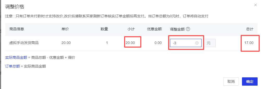 注意 : 只有订单未付款时才支持改价,改价后请联系买家刷新订单核实订单金额后再支付。当订单总额为0元时,订单将自动支付