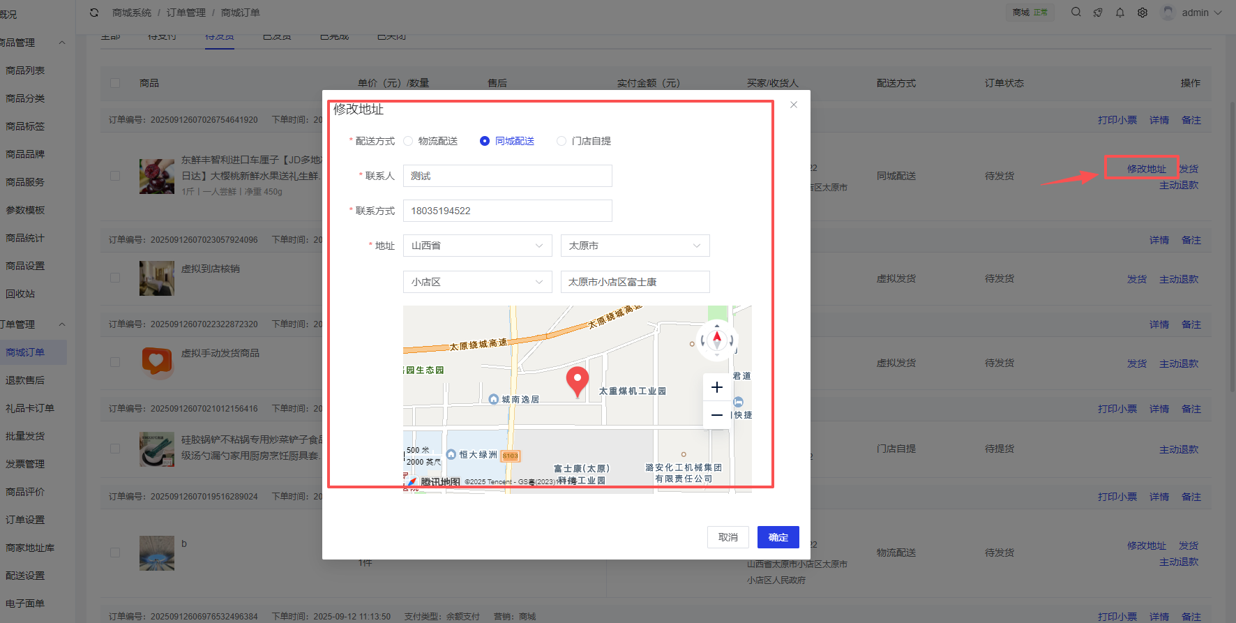 3、修改地址 (针对于配送方式为同城配送、物流配送,待支付/待发货的实物商品)