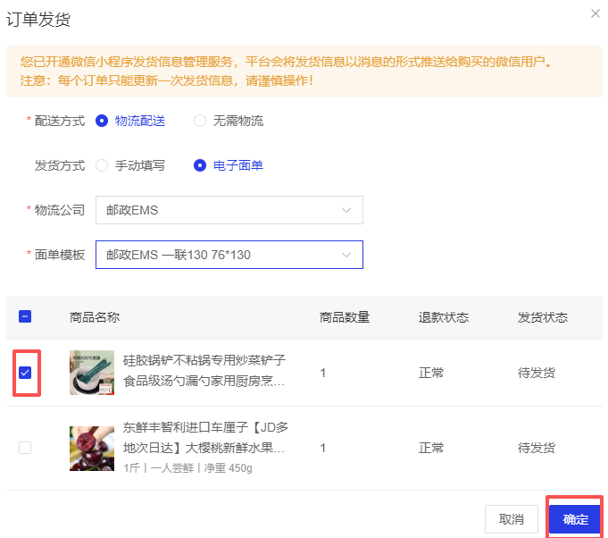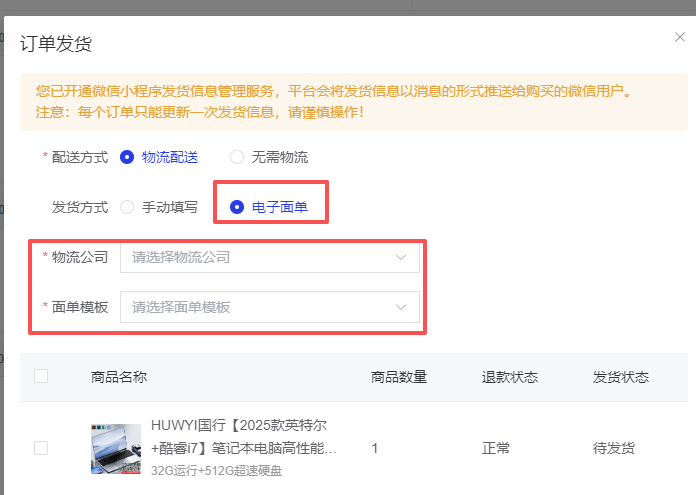 选择物流公司、面单模板电子面单(适用于订单较多,不方便手动录入的使用场景)