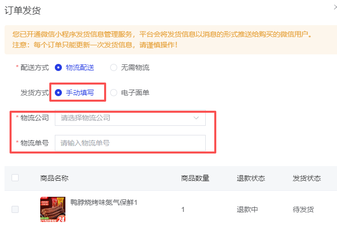 选择物流公司,填写物流单号(适用于线下手动发货,发完之后在后台手动录入发货的单号)