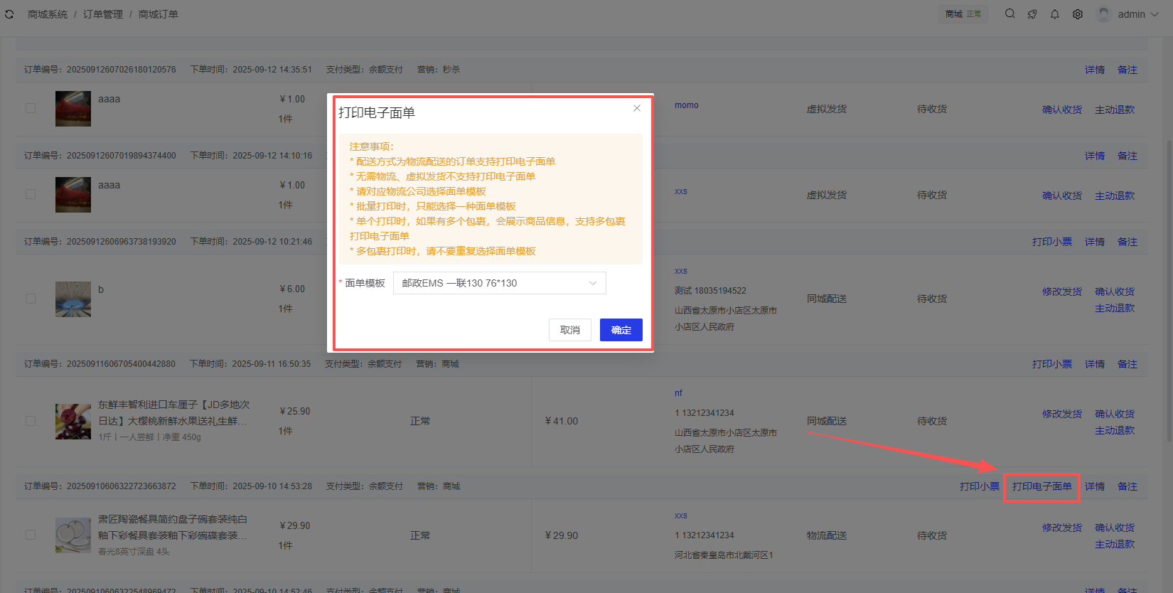 配置面单模板:商城系统 > 订单管理 > 电子面单设置 点击链接跳转