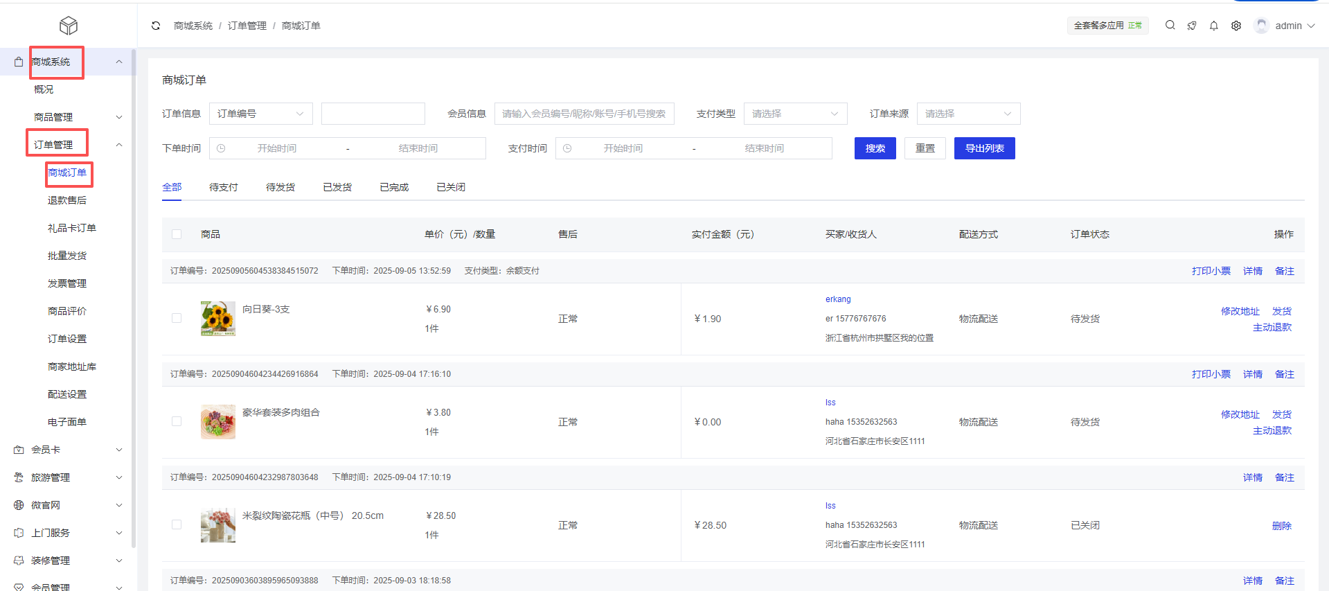 4、发货(针对同城配送、物流配送的实物商品,需要手动发货的虚拟产品)