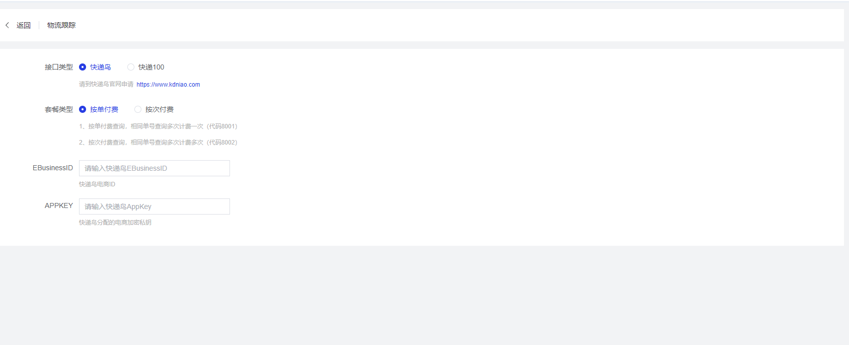 - 快递鸟:选择此接口需要在快递鸟官网申请账号并获取相应的接入凭证
