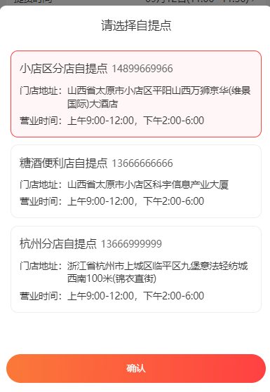 添加完成后,用户在下单时选择门店自提方式,即可看到已设置的自提点列表,并选择合适的自提点和自提时间进行下单。