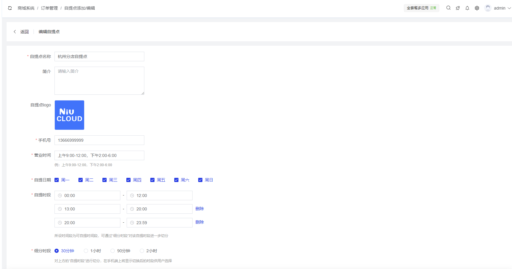 - 设置每日可提供自提服务的具体时间段,包括开始时间和结束时间