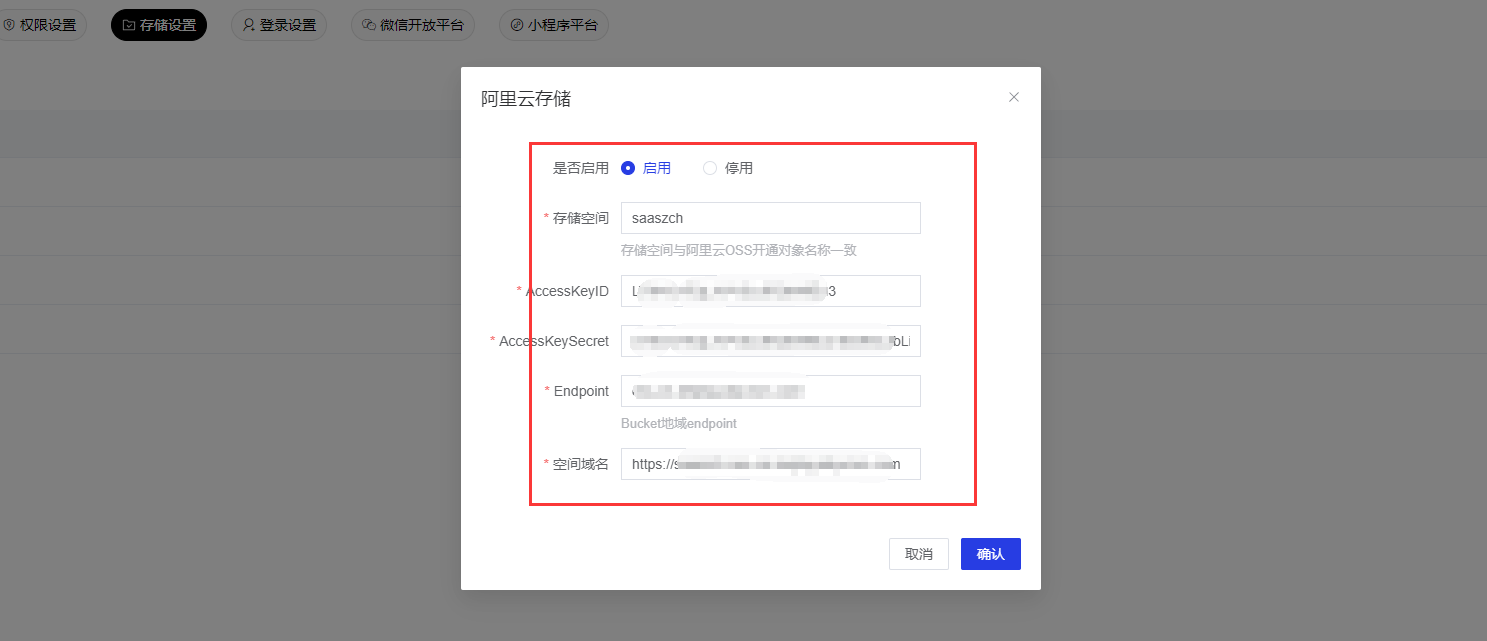 一、登录管理端后台,打开云存储设置,需要找到对应的配置项正确填写各项配置