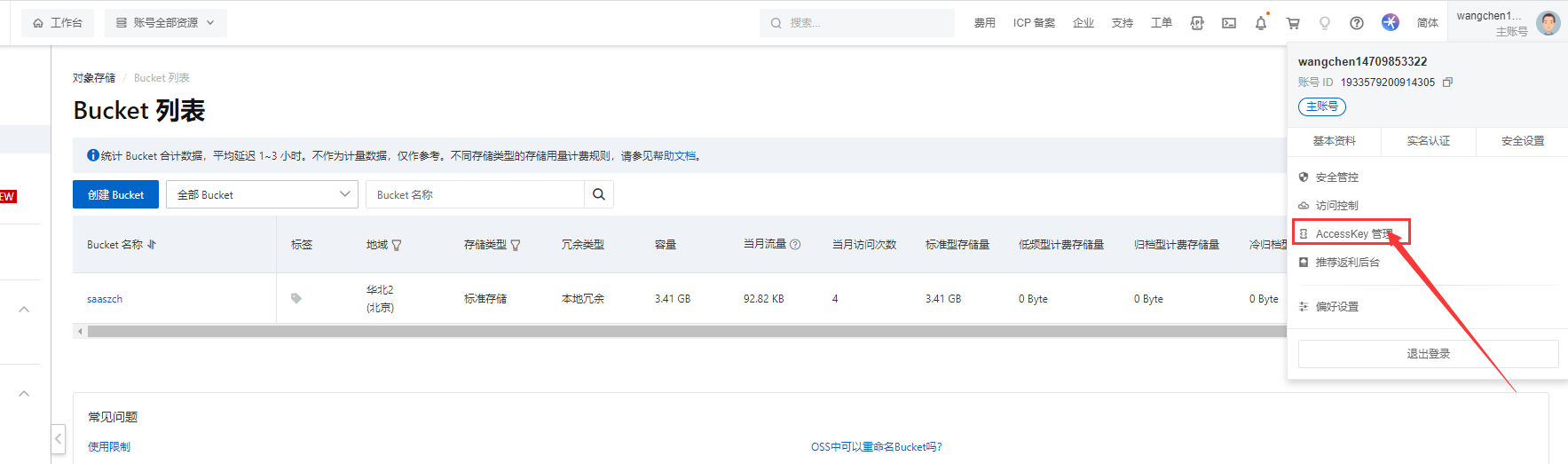 点击右上角账号,找到Accesskey管理,如果没有就需要创建,如果有就可以直接将AccessKey ID和AccessKeySecret复制到管理端配置中