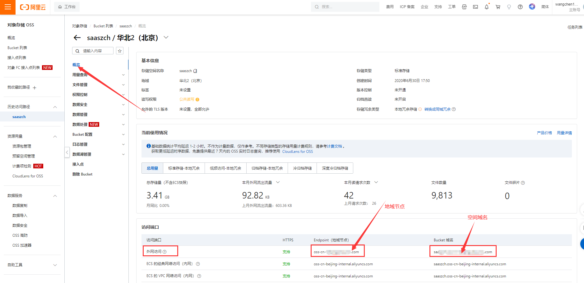 六、配置Endpoint和空间域名,通过如下图步骤找到Endpoint(地域节点)和空间域名,填到管理后台的配置中