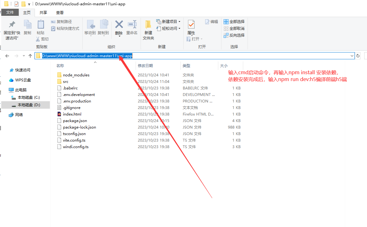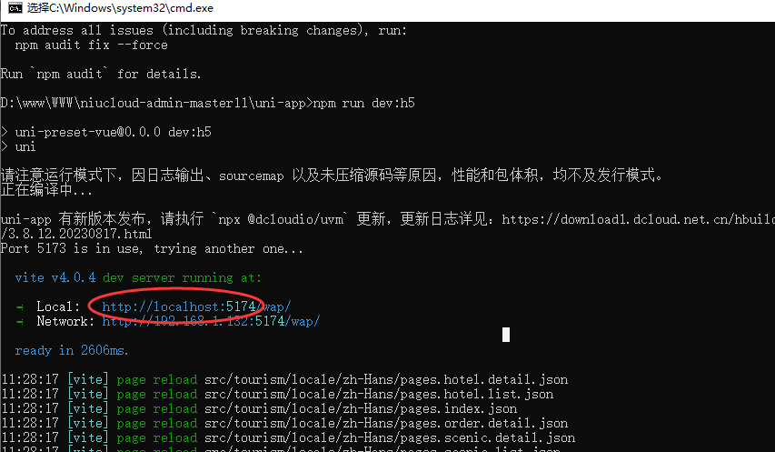 先在指定目录下执行命令行,编译h5,编译完成后在浏览器输入运行出来的h5地址就可以打开前端h5页面