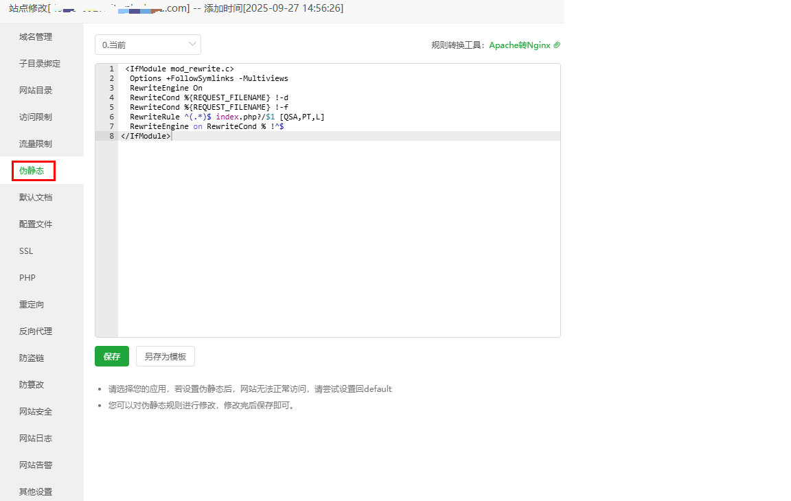 二、伪静态配置:将下方伪静态复制到网站的伪静态配置中,保存。如下图所示位置:
