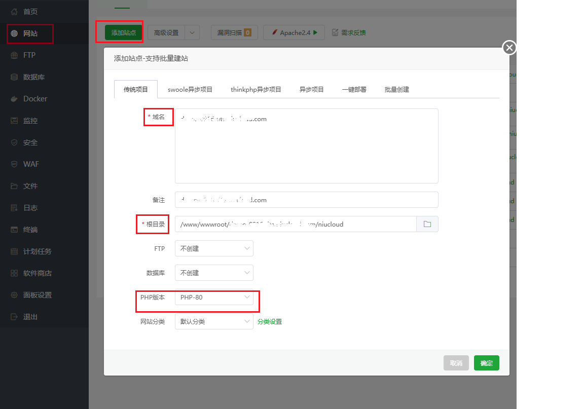 一、登录宝塔,点击【网站】--【添加站点】,填写域名,域名必须是已备案并且解析到该服务器ip上,备注可根据自己需要选填,根目录指向要具体到niucloud,ftp、数据库根据个人需要是否创建,php版本选择8.0。如下图所示: