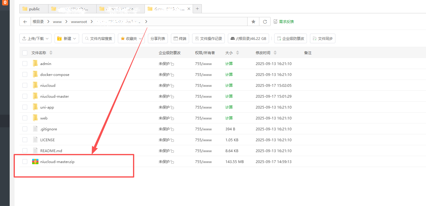 三、将下载下来的源码压缩包,上传至上述创建的网站根目录下,然后直接解压到根目录