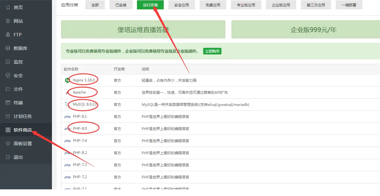 一、登录宝塔、点击【软件商店】--【运行环境】,安装php-8.0、mysql8.0、nginx/apache,选择极速安装,如下图所示: