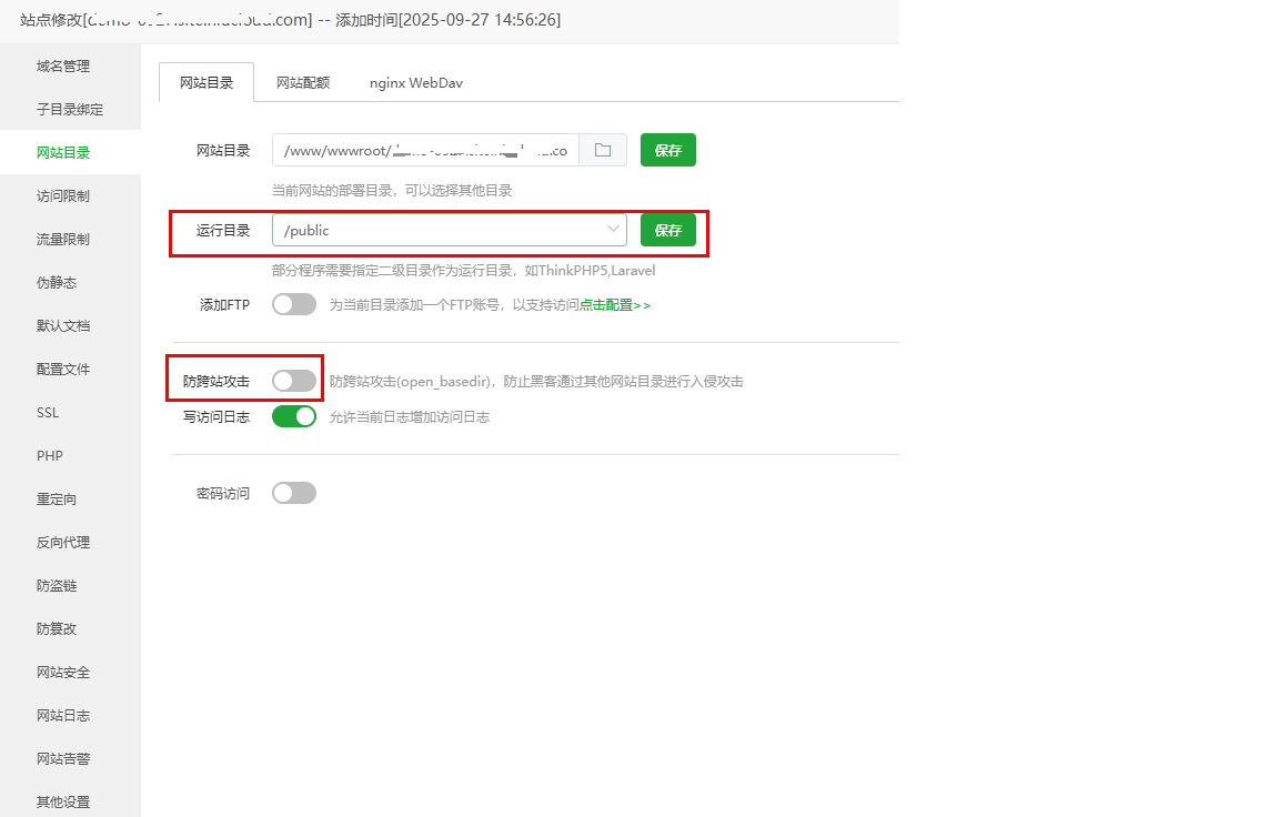 四、关闭宝塔中防跨域按钮,将运行目录指向niucloud下的public文件夹