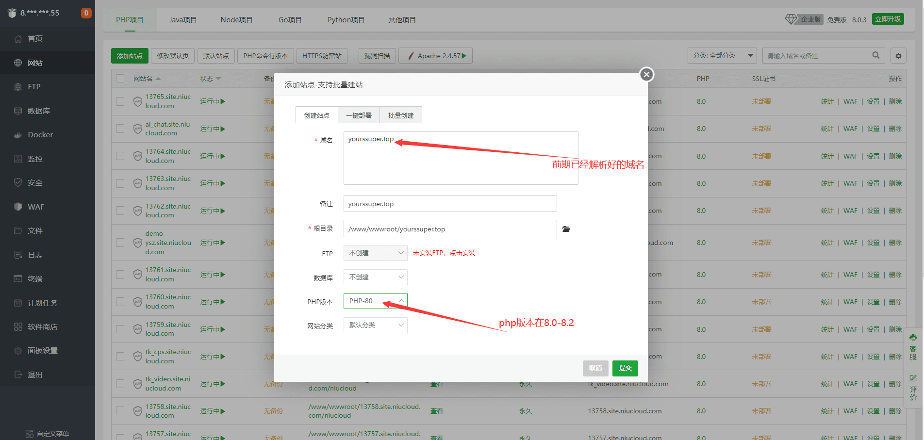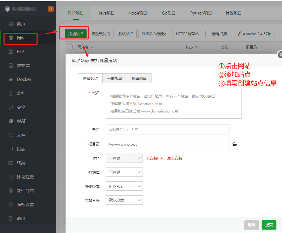 1. 登陆宝塔后,单击网站,点击添加站点