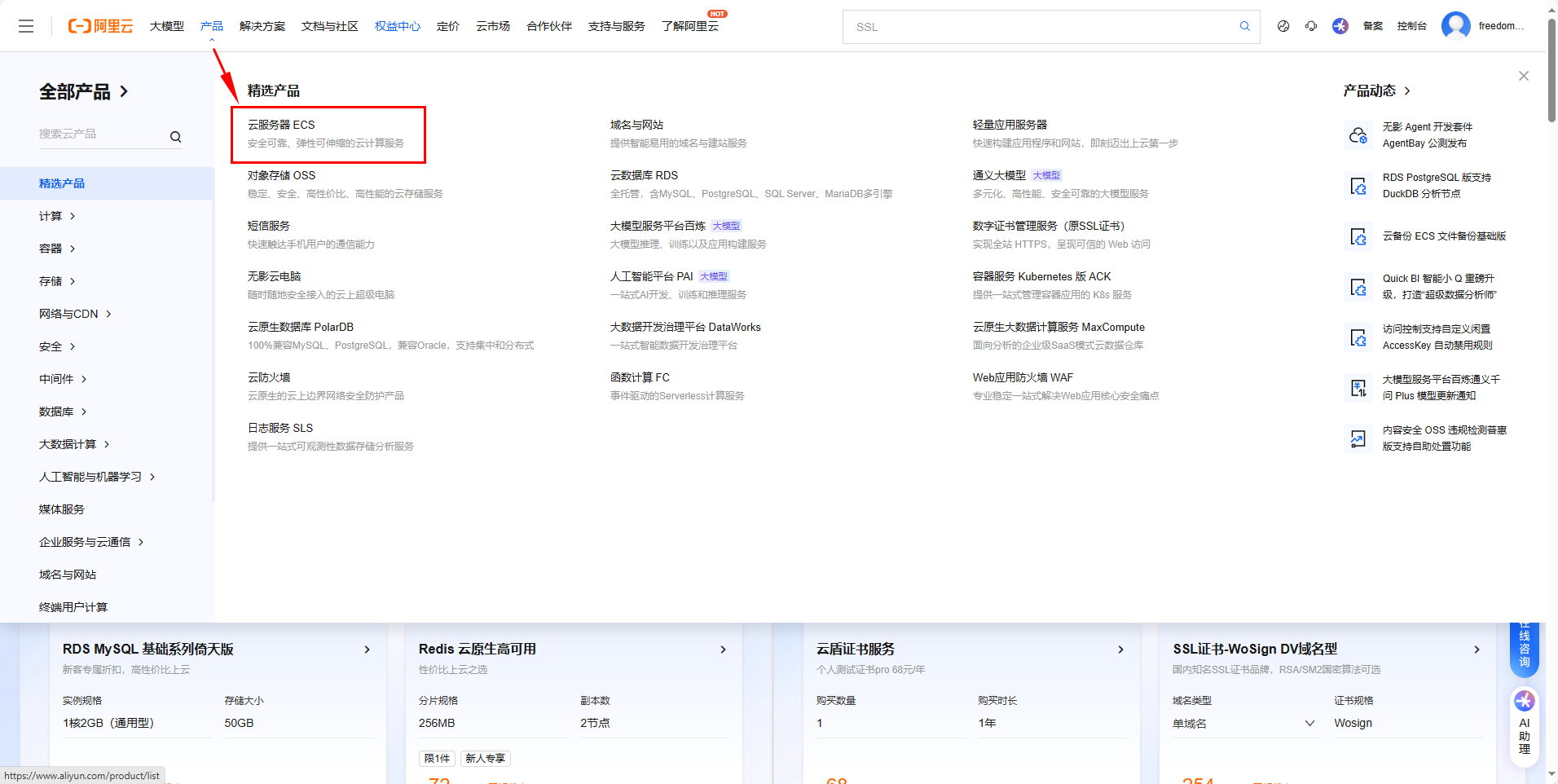 二、在顶部导航栏中选择 产品 → 精选产品 → 云服务器ECS