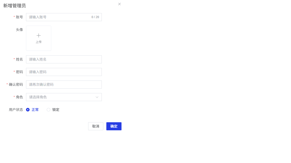 用户状态:单选按钮组,可选择管理员的状态(正常/锁定)