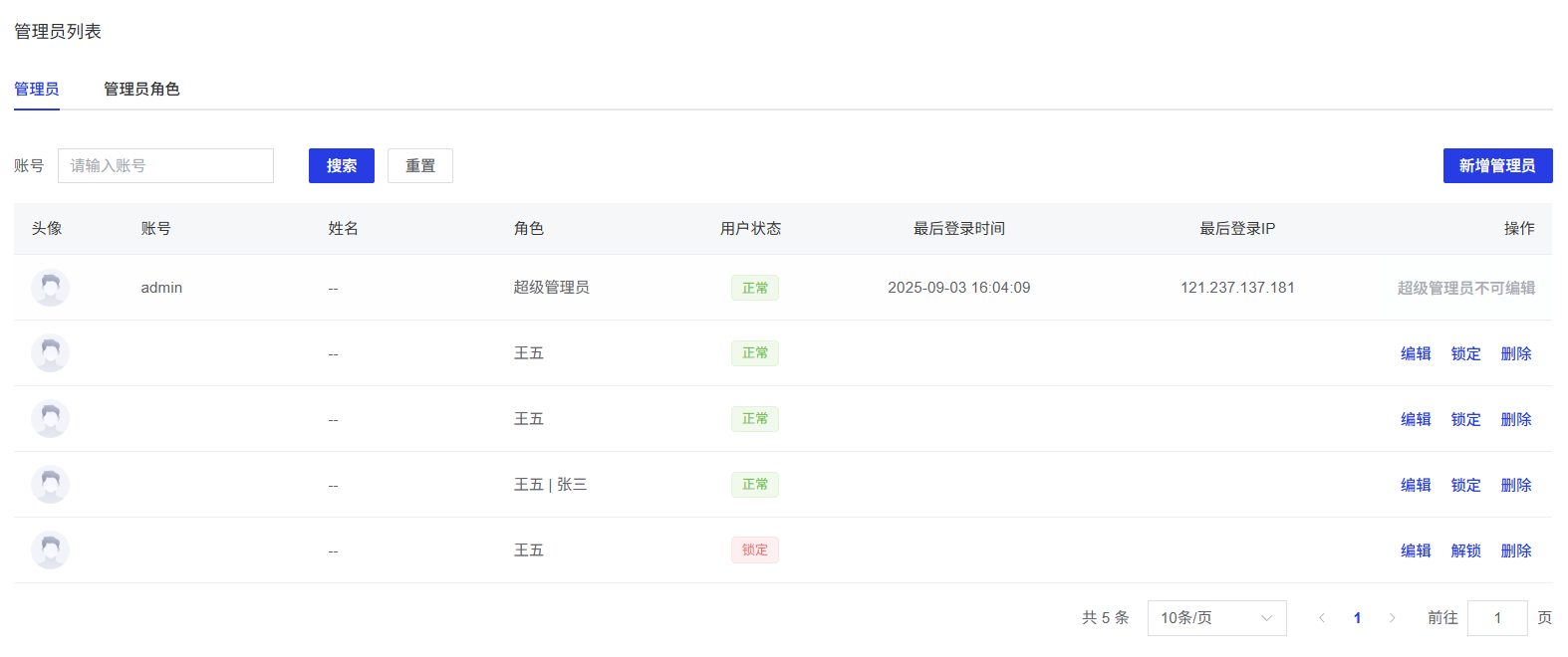 管理员列表是权限设置模块的重要组成部分,用于管理系统的管理员账号和管理员角色。通过管理员列表,超级管理员可以统一管理系统中的所有管理员用户及其角色权限。 管理员列表模块包含两个主要部分:管理员管理和管理员角色管理。