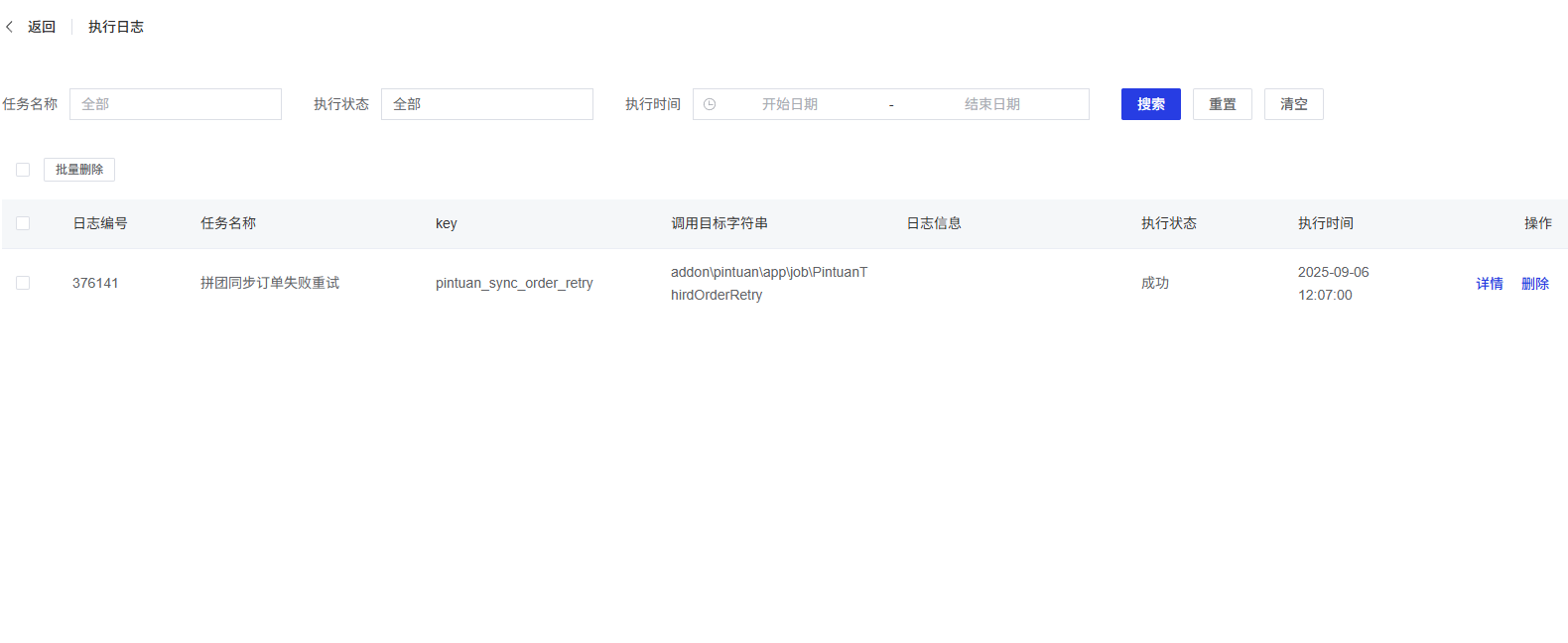 可以点击每条记录的"详情"按钮查看执行详情,或点击"删除"按钮删除该条日志。