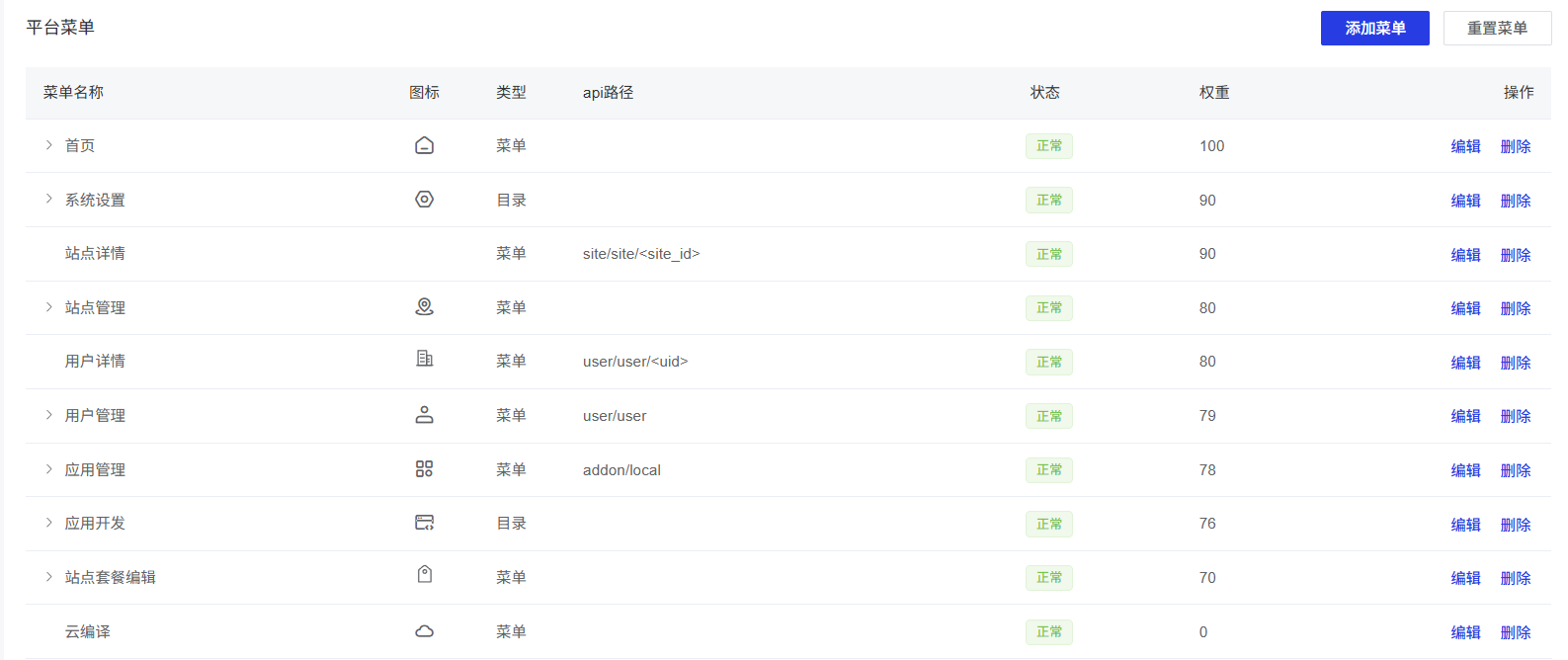 平台菜单用于配置和管理系统后台的导航菜单结构,支持添加、编辑、删除和重置菜单等操作。