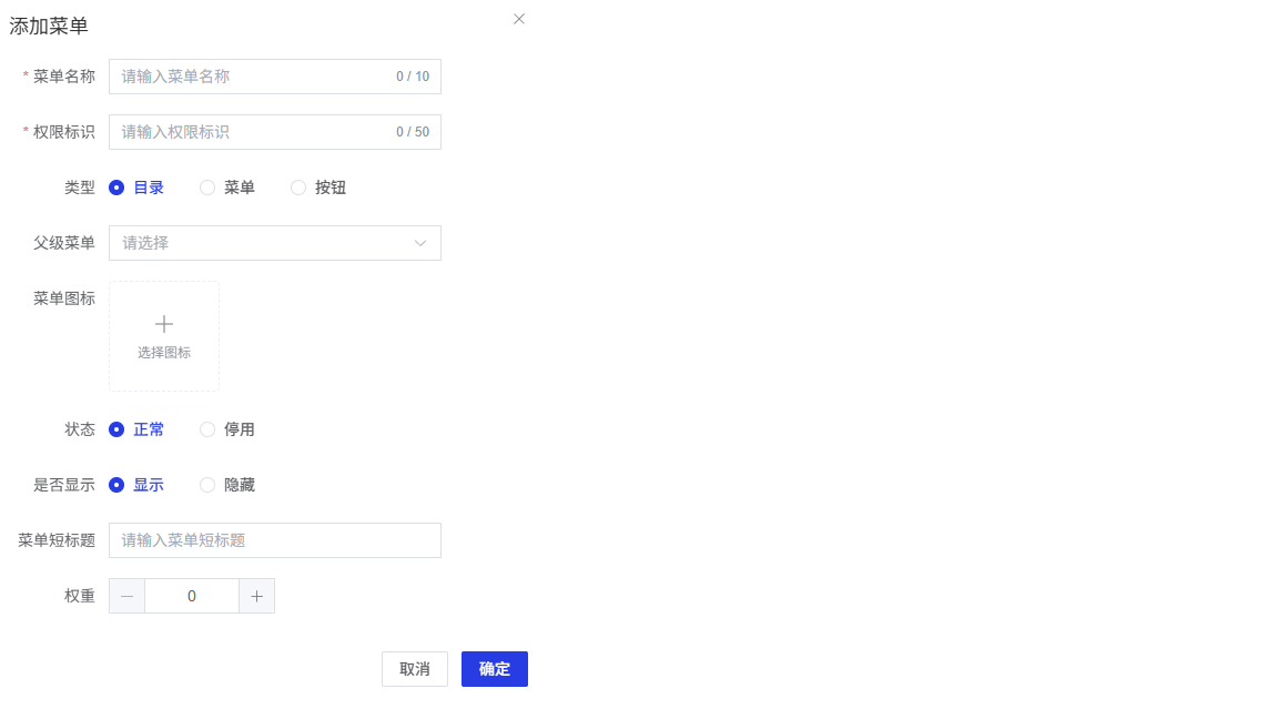 添加新的菜单项到平台菜单中。根据菜单类型不同,配置项会有所差异。
