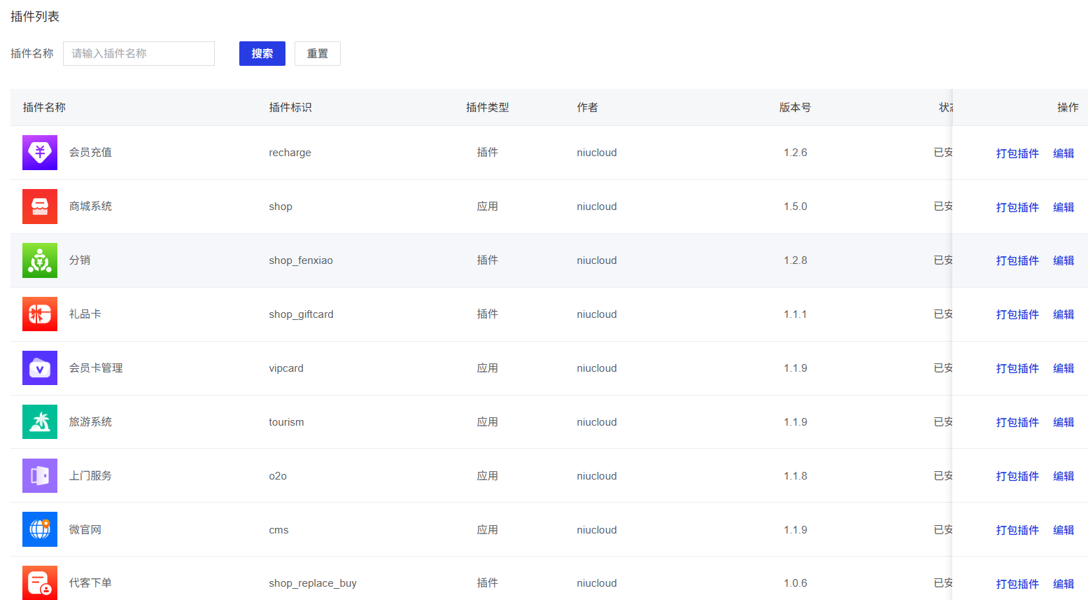 插件列表显示系统中所有插件信息,并提供了插件的基本操作功能。通过此页面,用户可以快速查找特定插件并进行相应的管理操作。