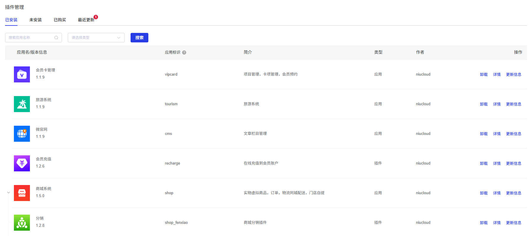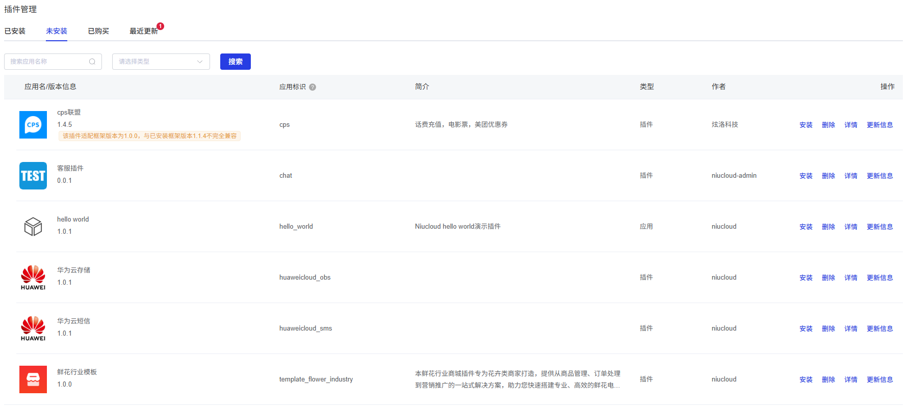 插件管理用于管理和维护系统中的各类插件。通过插件管理,可以方便地查看、安装、升级、删除插件。