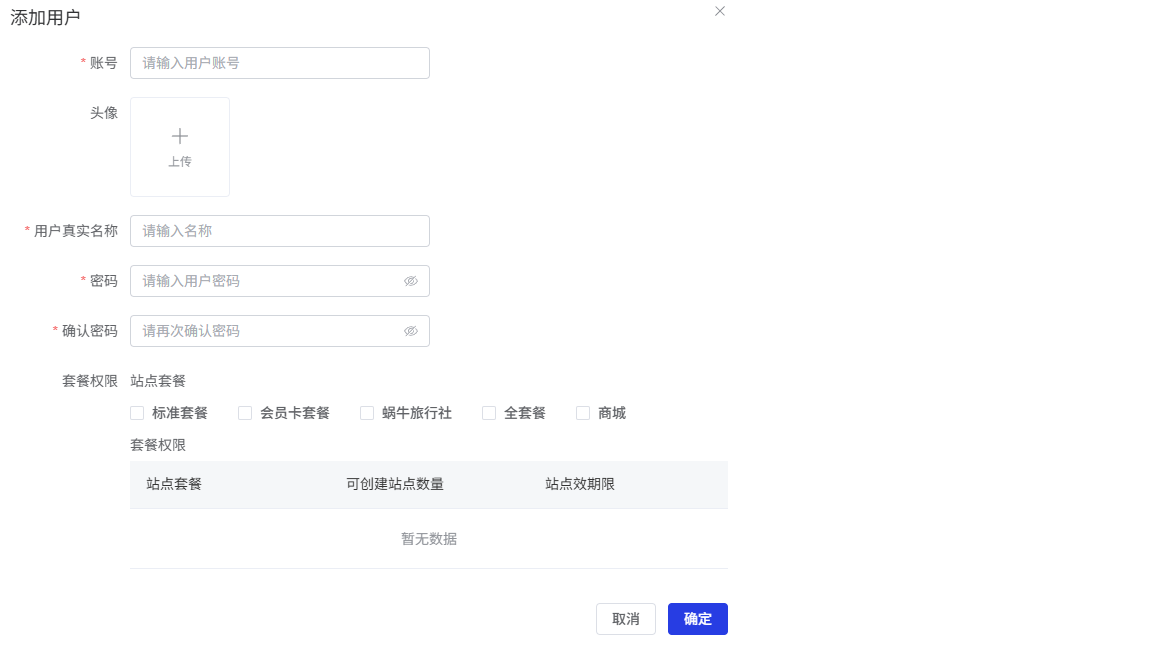 在"套餐权限"区域勾选用户可使用的套餐类型,包括:站点套餐、会员卡套餐、蜗牛旅行社、全套餐、商城。