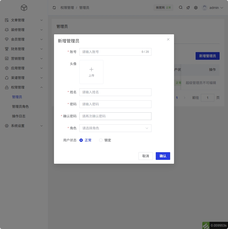 用户状态:单选按钮组,可选择管理员的状态(正常/锁定)。