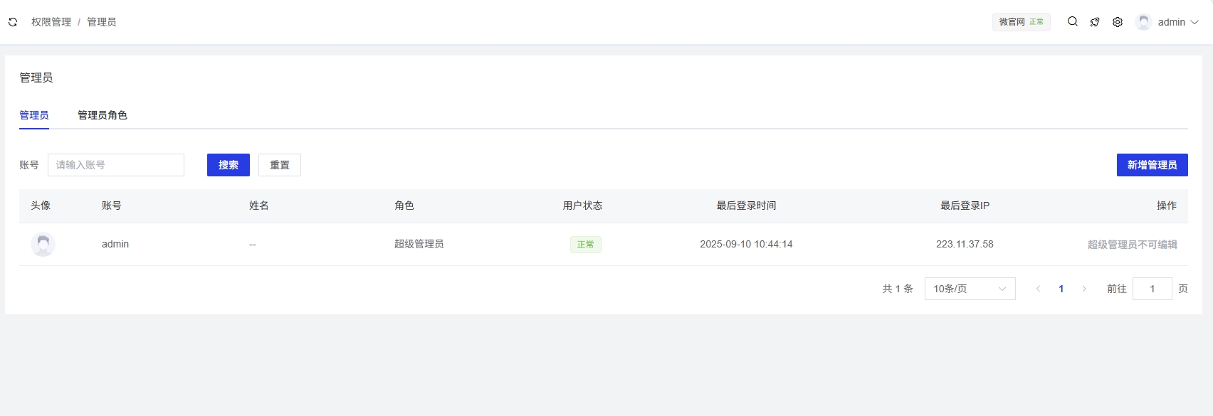超级管理员账号具有最高权限,不可编辑和删除。