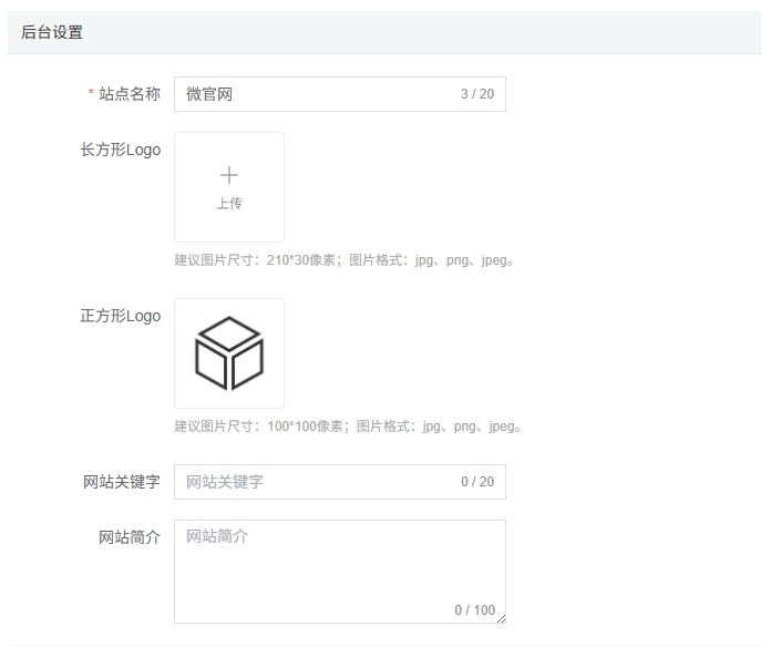 功能说明:上传后台管理系统使用的正方形Logo图片,用于系统内部展示。
