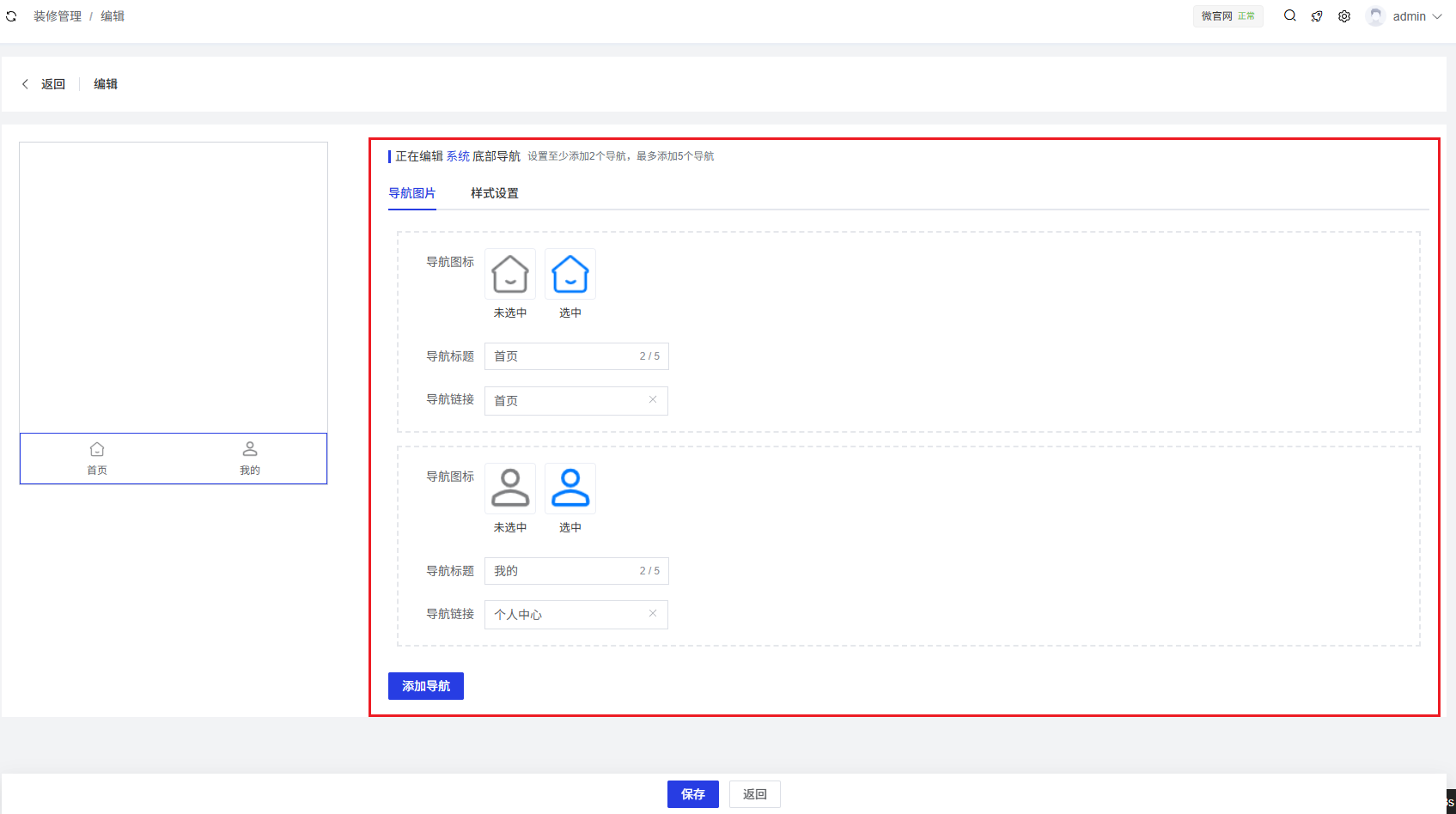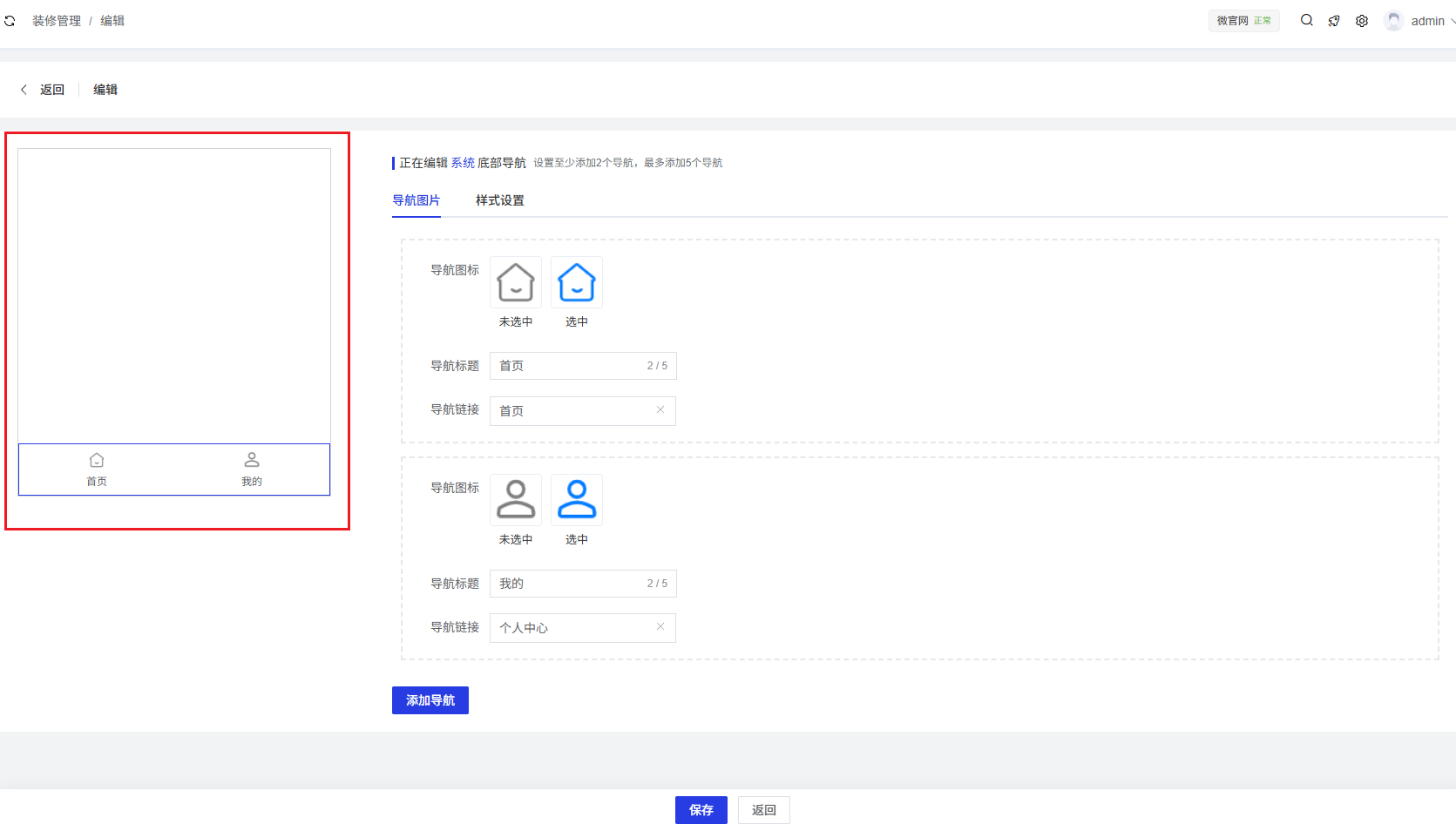 添加导航按钮:点击后可添加新的导航项,至少添加2个导航,最多添加5个导航。