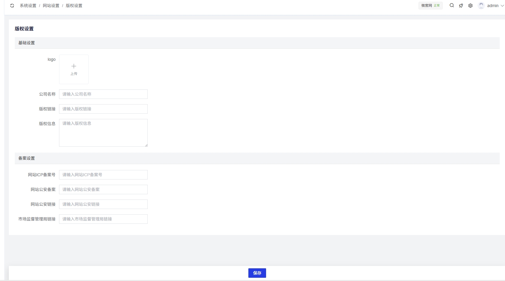 版权设置用于配置站点的版权信息、公司信息以及各种备案信息,这些信息通常会在站点底部或其他显著位置显示,用于展示站点的合法性和归属权。